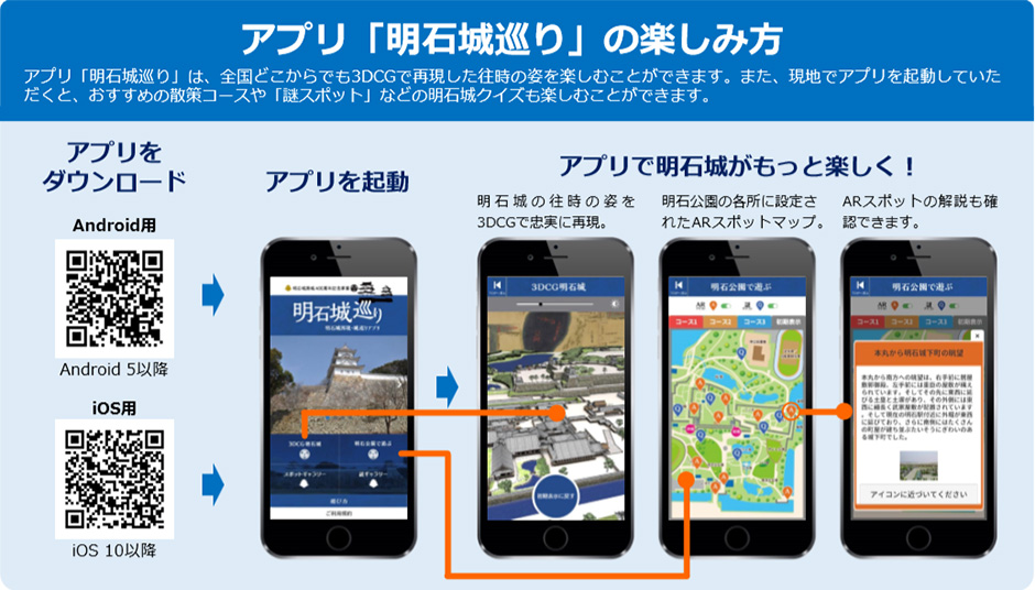 明石城を3DCGで再現し、城巡りの仕掛けを組み込んだスマホ用ARアプリは、「明石城巡り」として2019年3月23日から始まった「明石城築城400周年記念事業」イベントのスタートに合わせて公開されました。